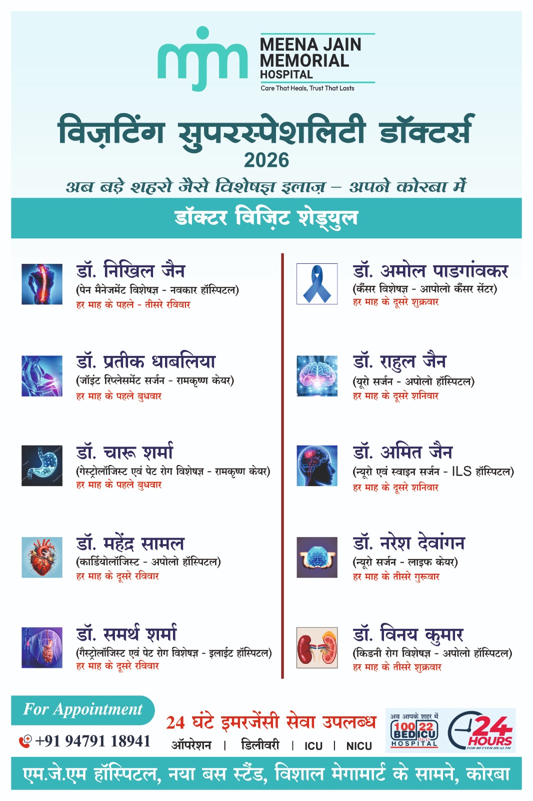 MJM Multispeciality Hospital is one of the leading healthcare institutions in Korba, Chhattisgarh. With 100 beds, advanced diagnostic and surgical infrastructure, and a team of highly skilled doctors, we offer comprehensive care across all major specialties.
